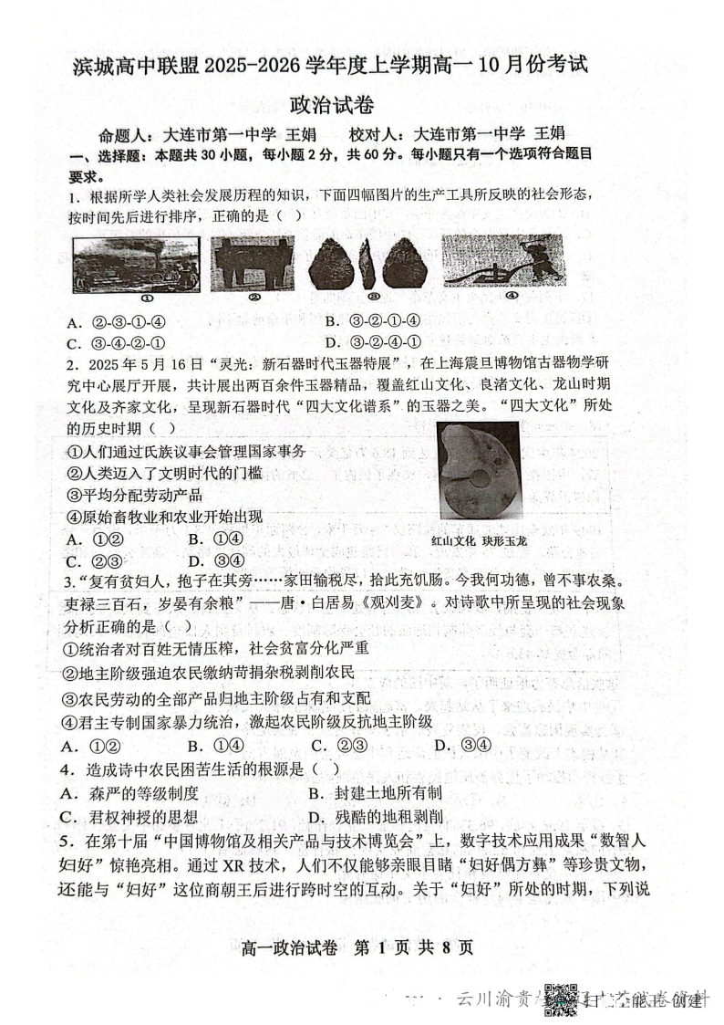 高一政治+答案--辽宁省大连市滨城高中联盟2025-2026学年度上学期高一10月份联考