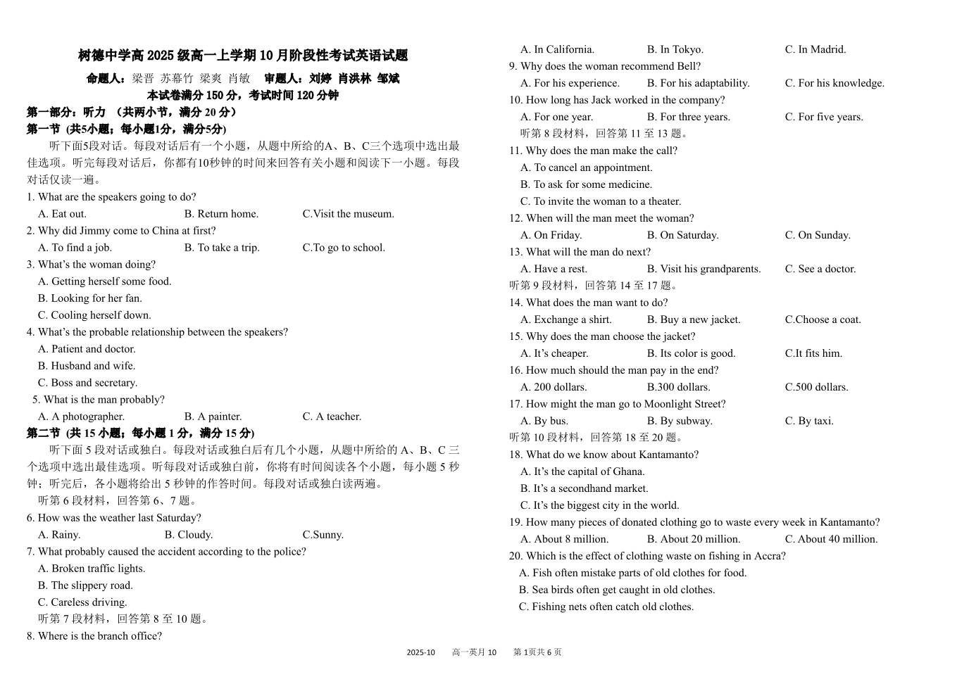 高一英语+答案--四川省成都市树德中学2025-2026学年高一上学期10月月考
