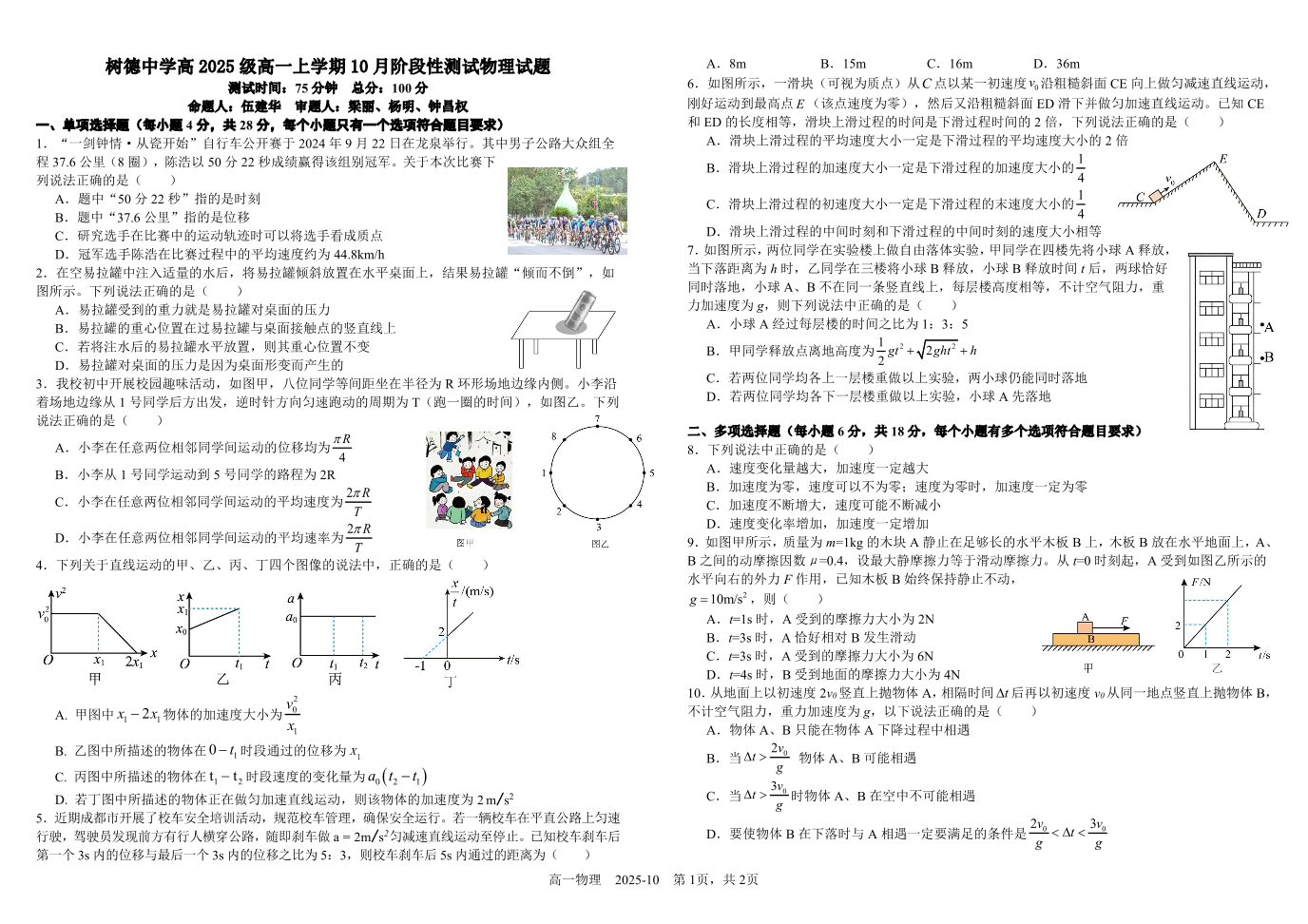 高一物理--四川省成都市树德中学2025-2026学年高一上学期10月月考