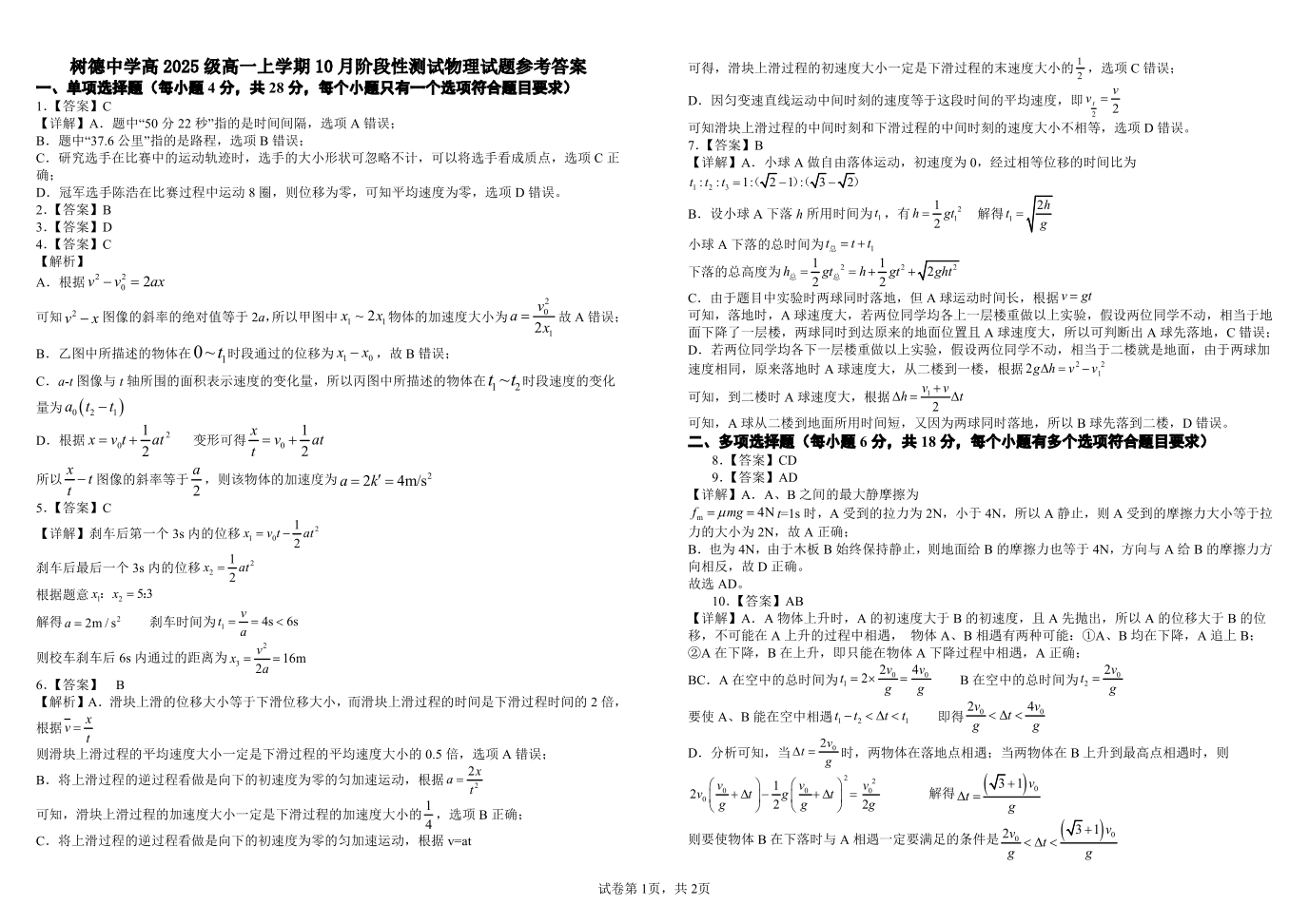 高一物理答案--四川省成都市树德中学2025-2026学年高一上学期10月月考