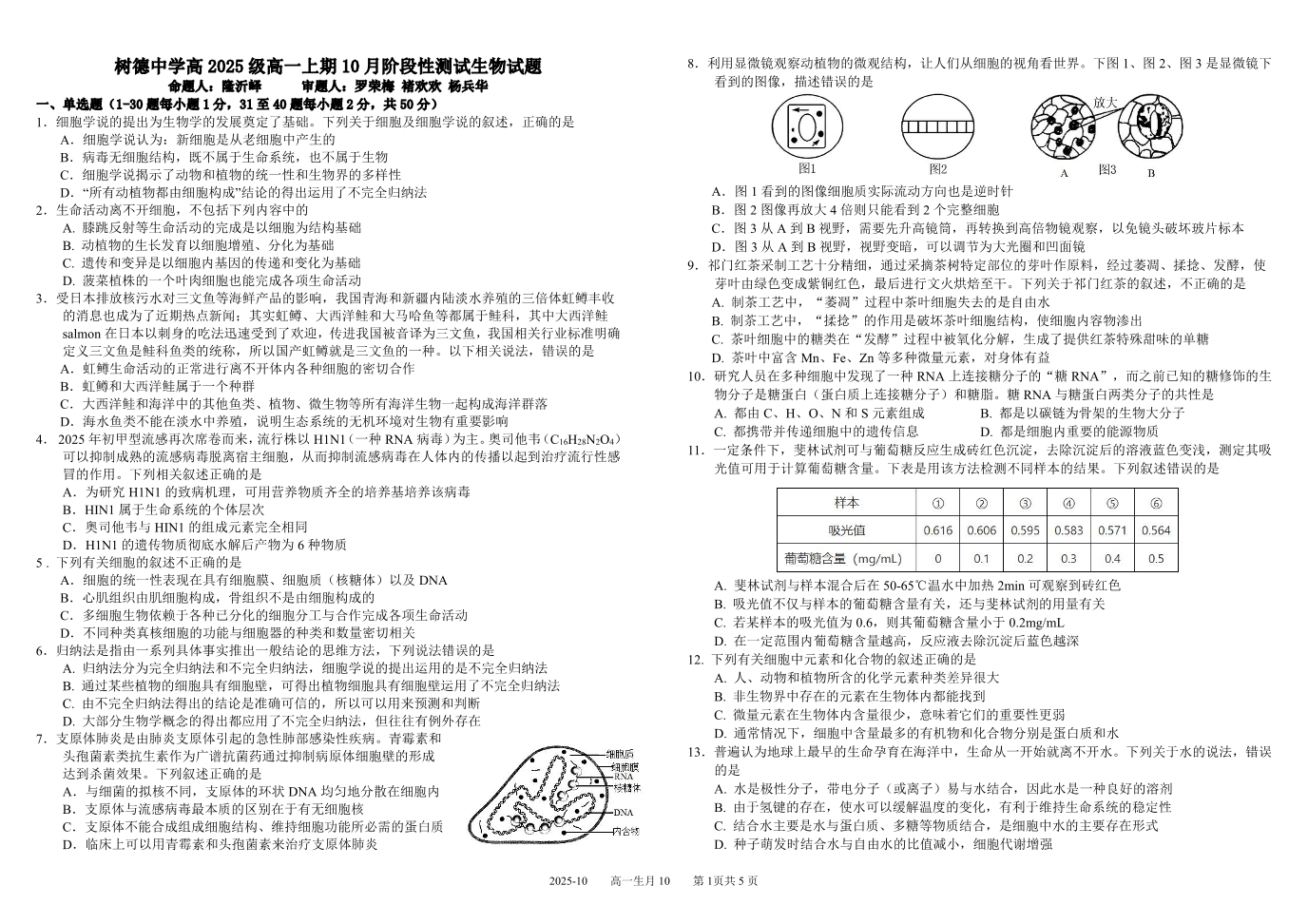 高一生物+答案--四川省成都市树德中学2025-2026学年高一上学期10月月考
