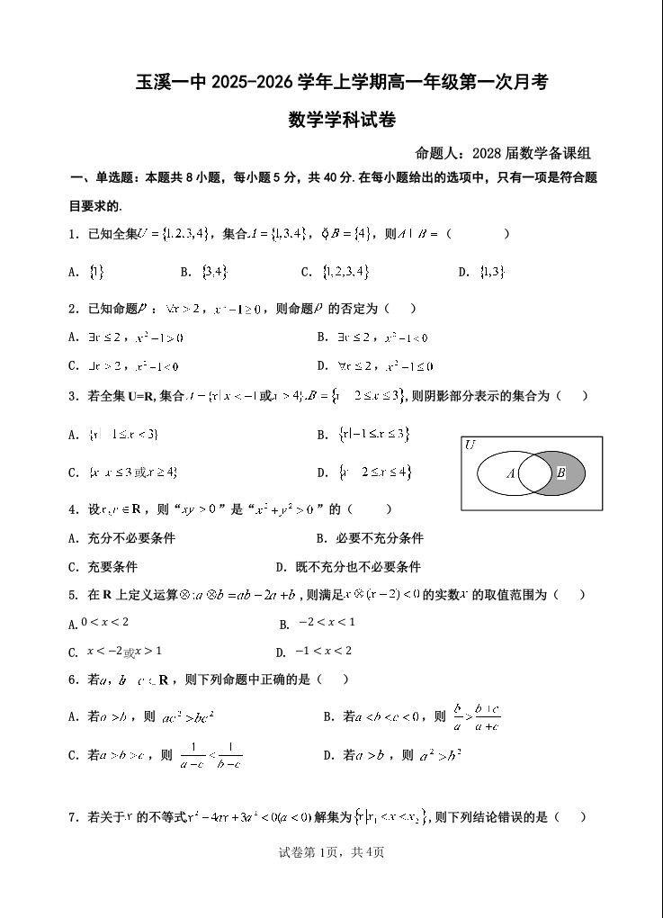 高一数学--云南省玉溪第一中学2025-2026学年高一上学期第一次月考