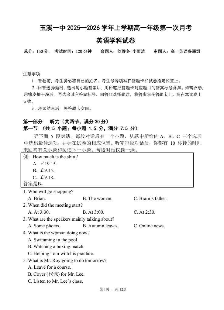 高一英语--云南省玉溪第一中学2025-2026学年高一上学期第一次月考