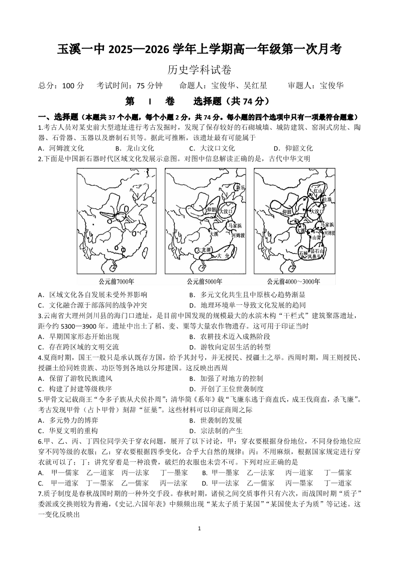 高一历史--云南省玉溪第一中学2025-2026学年高一上学期第一次月考