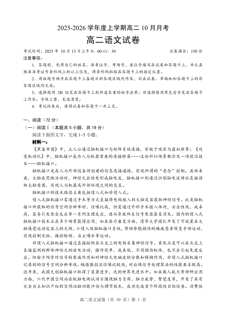 高二语文--湖北省楚天协作体2025-2026学年度上学期高二10月月考