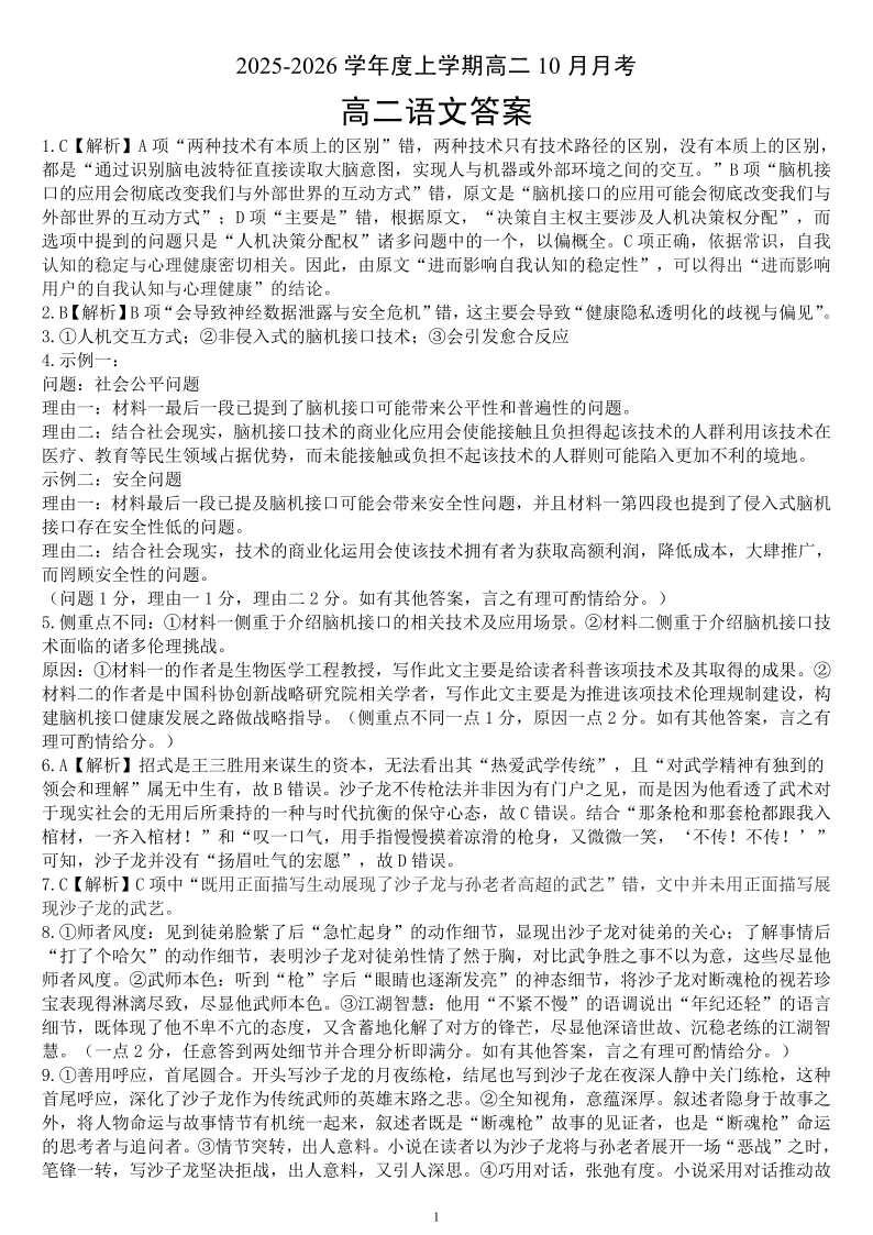 高二语文答案--湖北省楚天协作体2025-2026学年度上学期高二10月月考