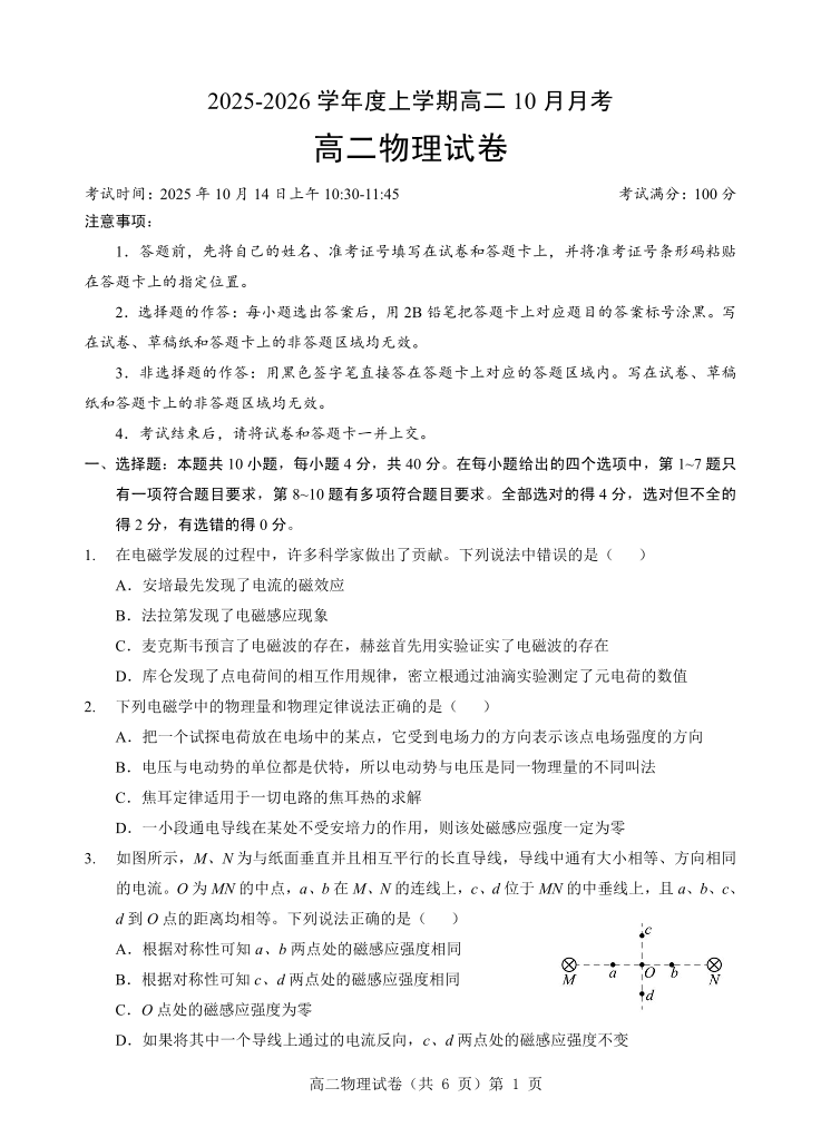 高二物理--湖北省楚天协作体2025-2026学年度上学期高二10月月考