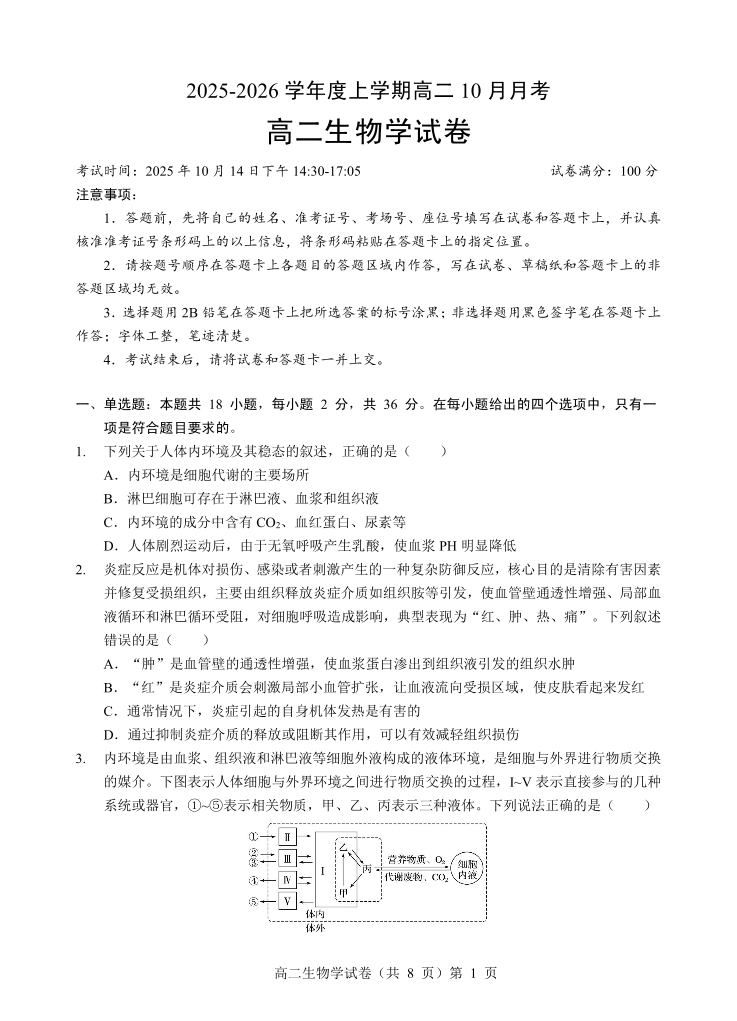 高二生物--湖北省楚天协作体2025-2026学年度上学期高二10月月考