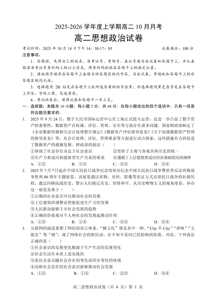 高二政治--湖北省楚天协作体2025-2026学年度上学期高二10月月考