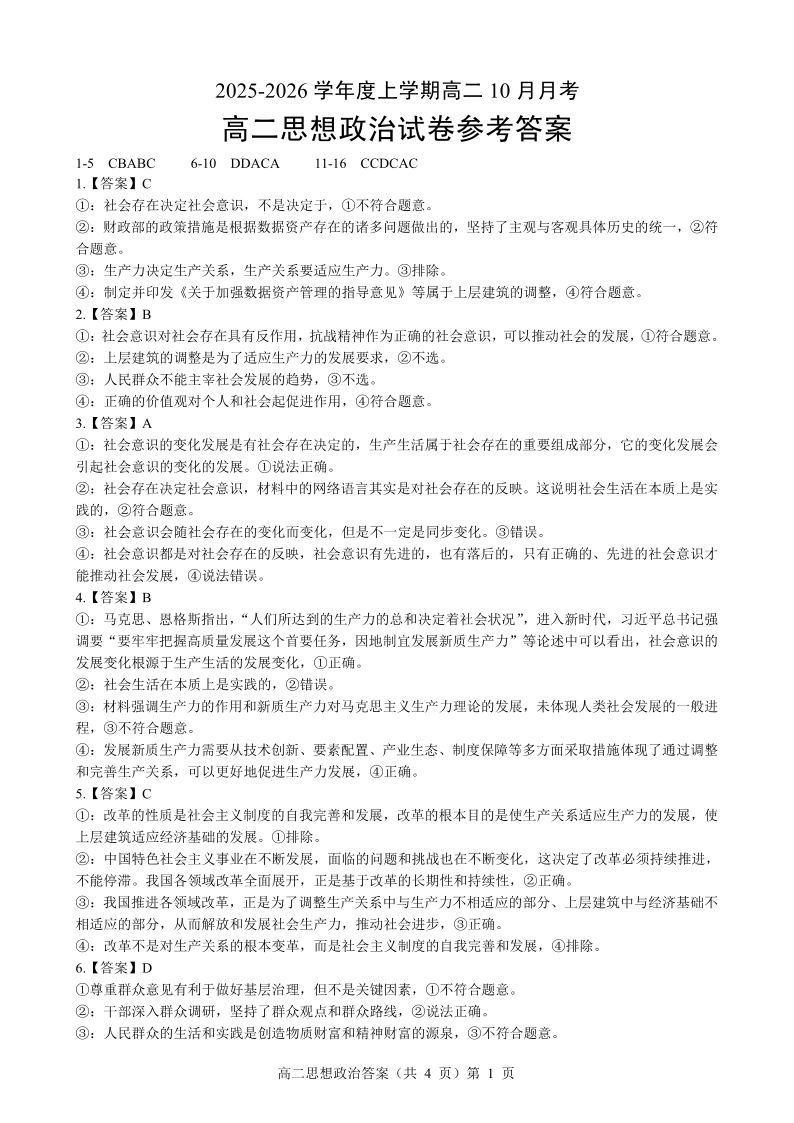 高二政治答案--湖北省楚天协作体2025-2026学年度上学期高二10月月考