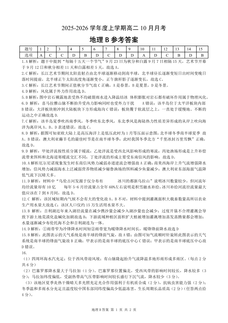 高二地理B答案--湖北省楚天协作体2025-2026学年度上学期高二10月月考