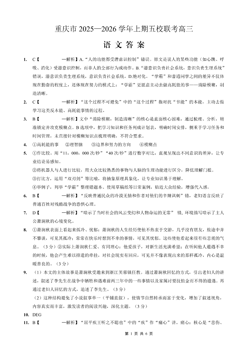 高三语文答案--重庆市五校联盟2026届高三10月联考