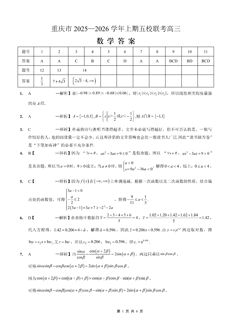 高三数学答案--重庆市五校联盟2026届高三10月联考