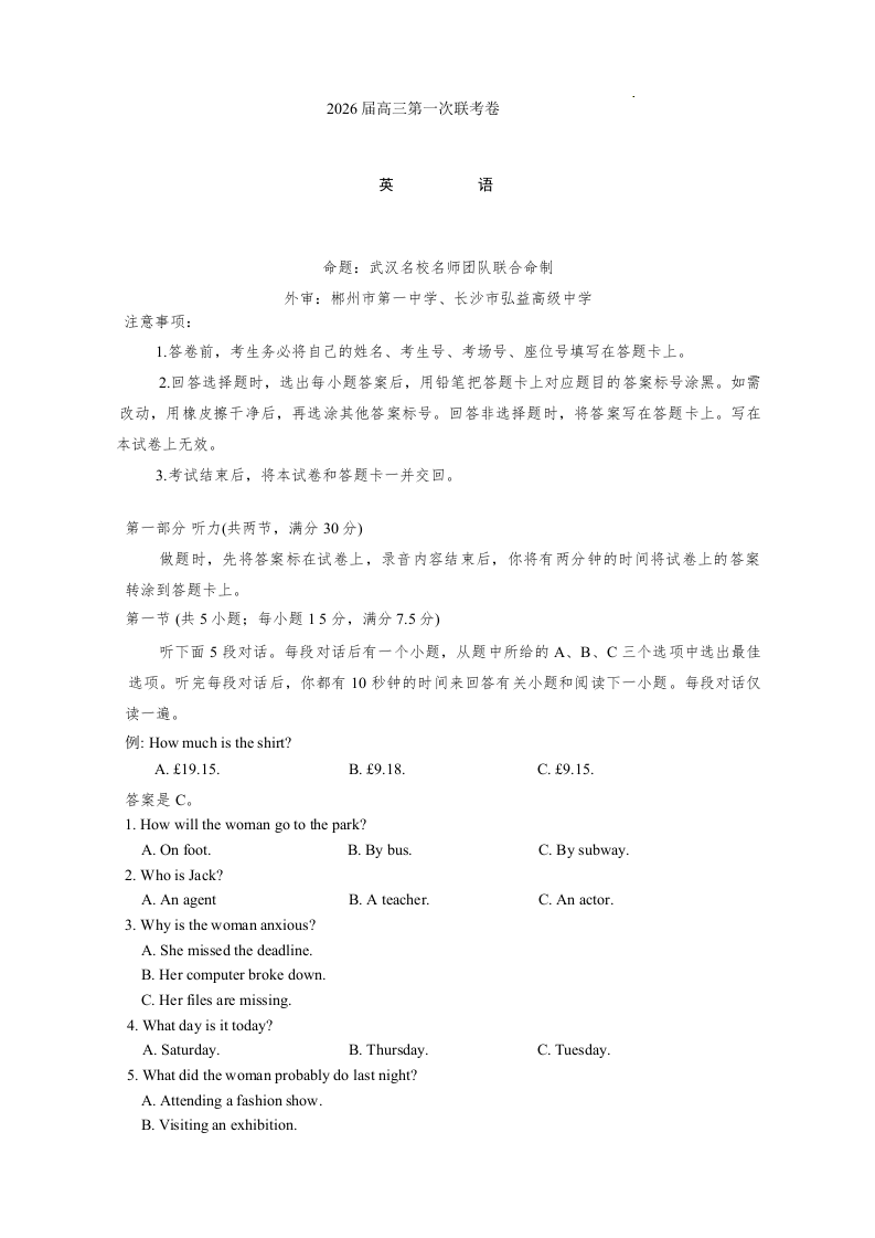 高三英语--湖南名校联考联合体2026届高三上学期10月月考
