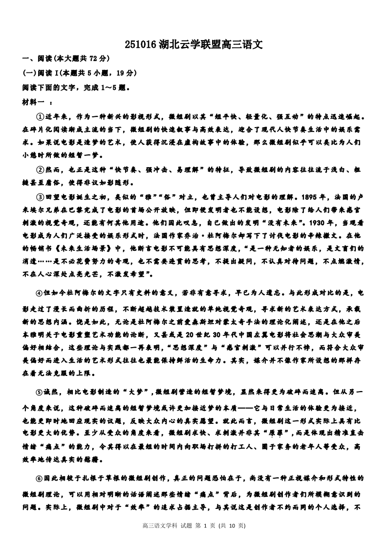 高三语文--湖北云学联盟2026届高三上学期10月考试