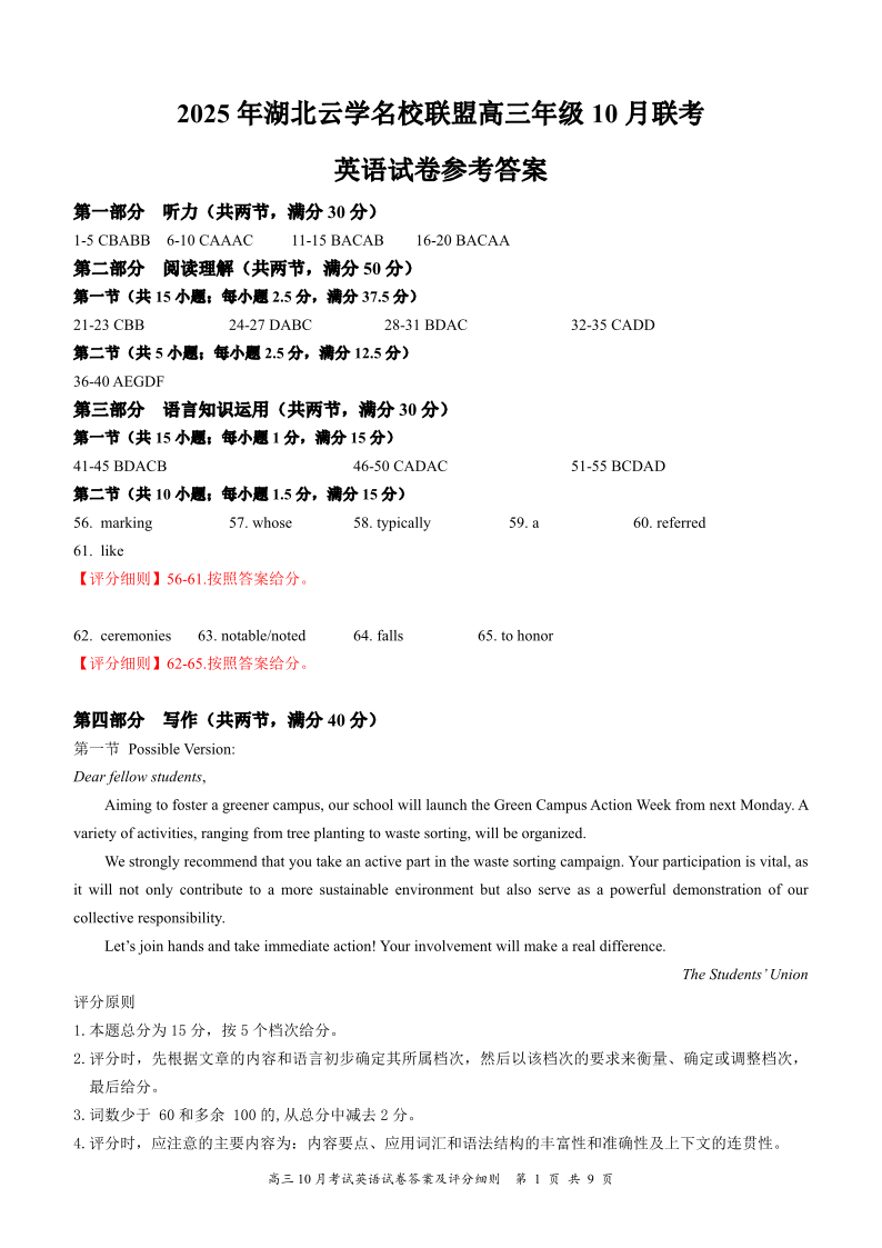 高三英语答案--湖北云学联盟2026届高三上学期10月考试