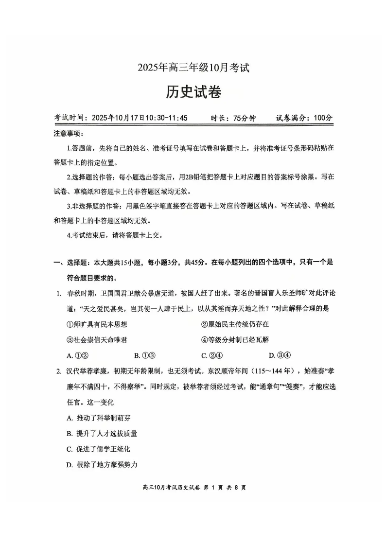 高三历史+答案--湖北云学联盟2026届高三上学期10月考试