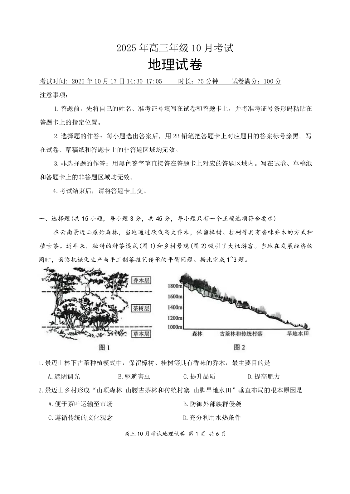 高三地理+答案--湖北云学联盟2026届高三上学期10月考试