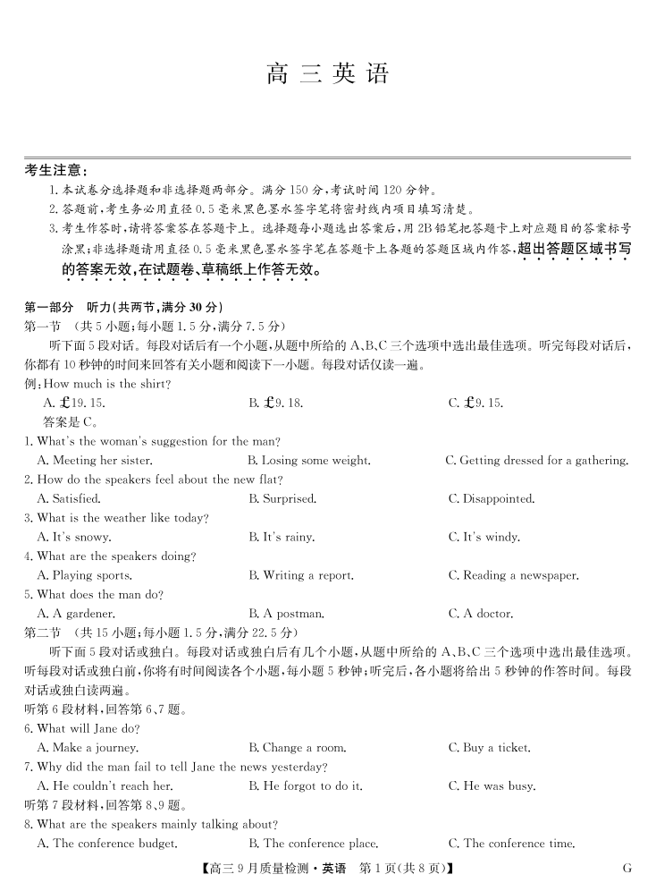 高三英语--湖北省九师联盟2026届高三9月质量检测巩固卷(10月联考)