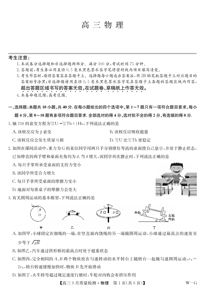 高三物理--湖北省九师联盟2026届高三9月质量检测巩固卷(10月联考)