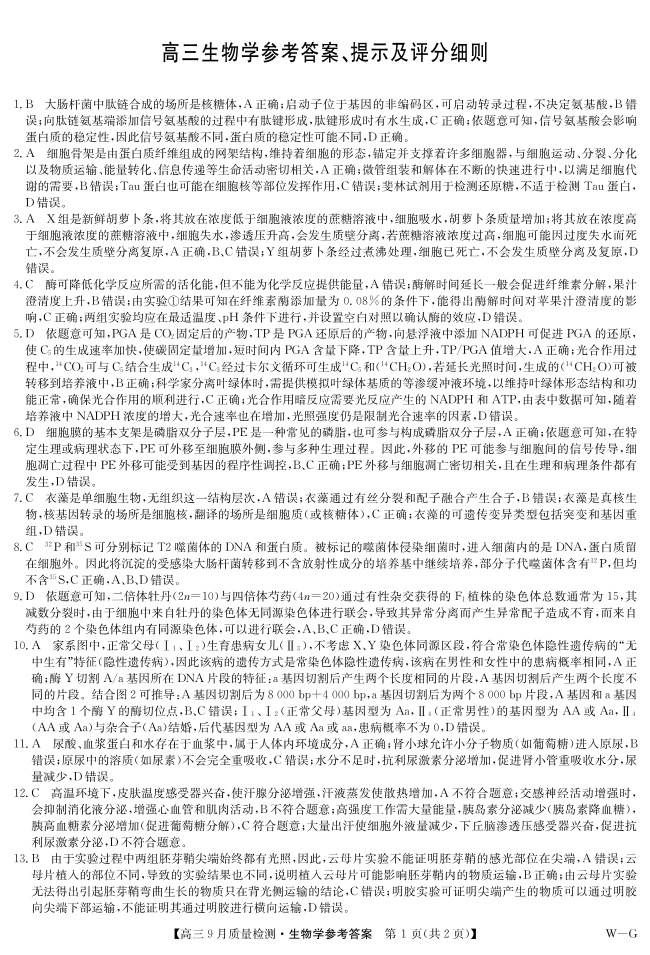 高三生物答案--湖北省九师联盟2026届高三9月质量检测巩固卷(10月联考)