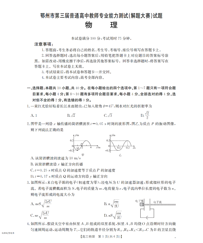 高三物理--湖北省鄂州市2026届高三上学期第三届普通高中教师专业能力测试(解题大赛)