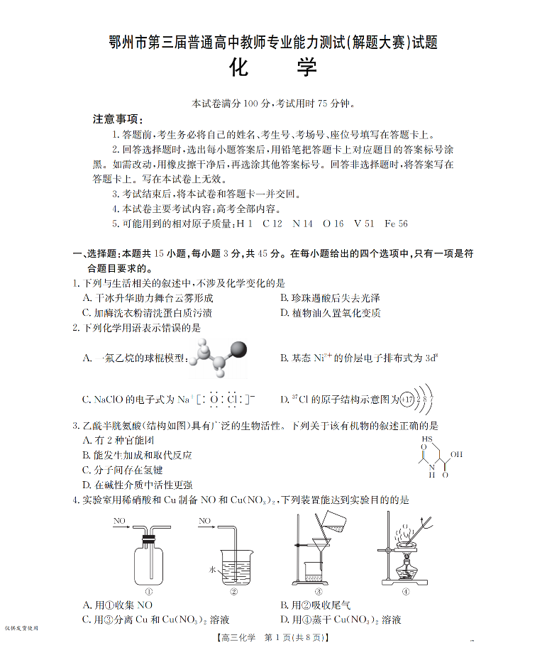 高三化学--湖北省鄂州市2026届高三上学期第三届普通高中教师专业能力测试(解题大赛)