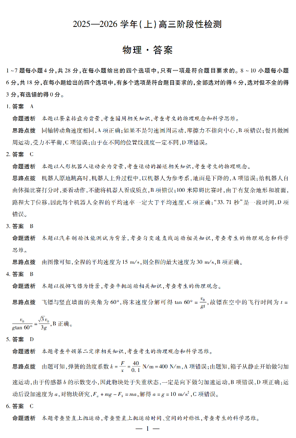 高三物理答案--河南省天一大联考 2026届高三10月阶段性检测