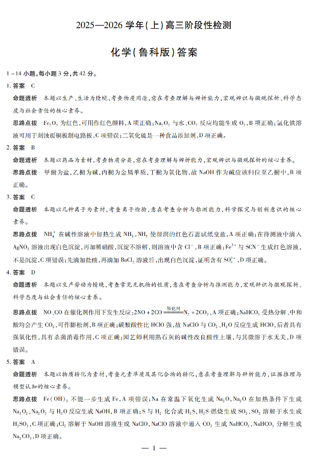 高三化学答案(鲁科版)--河南省天一大联考 2026届高三10月阶段性检测