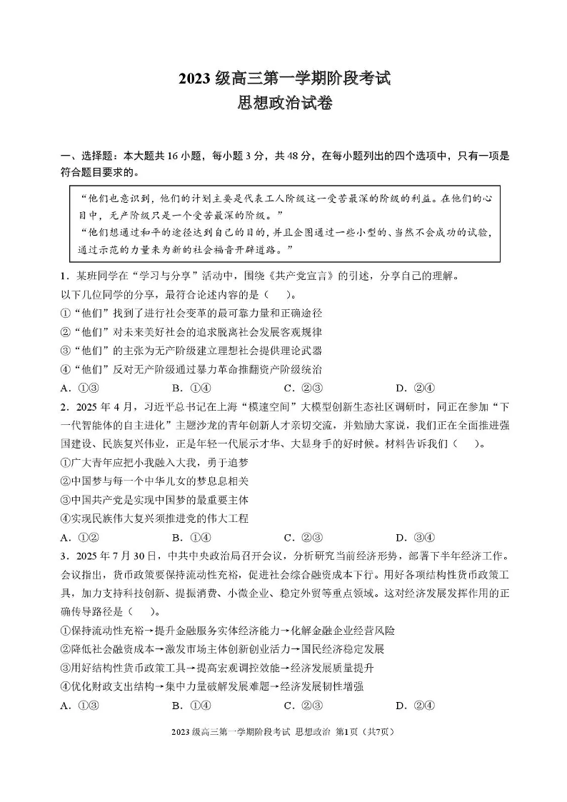 高三政治--广东省汕头市金山中学2026届高三上学期10月阶段考试