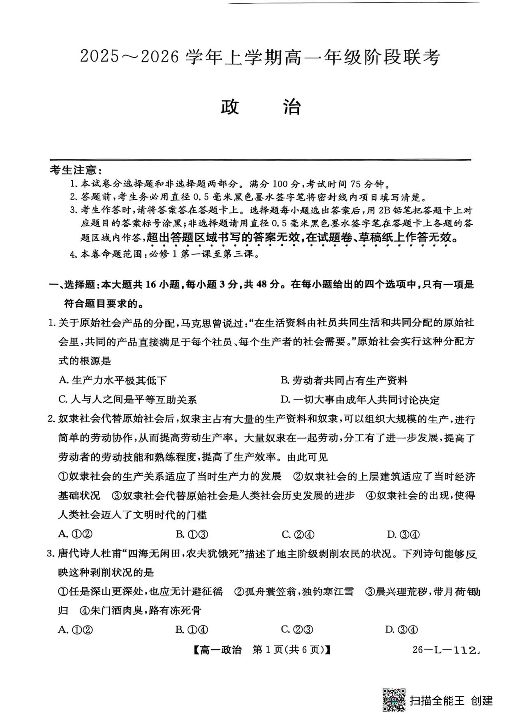 高一政治--安徽省江淮名校2025-2026学年高一上学期阶段联考