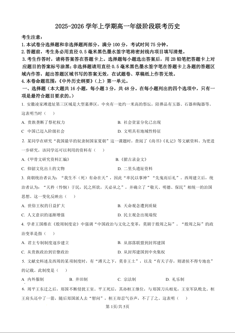 高一历史(原卷版)--安徽省江淮名校2025-2026学年高一上学期阶段联考