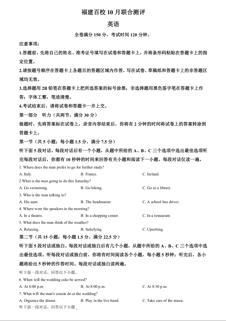 高三英语+答案--福建省2026届高三上学期10月百校联合测评