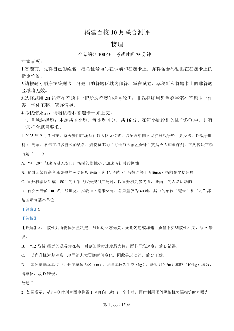 高三物理答案--福建省2026届高三上学期10月百校联合测评