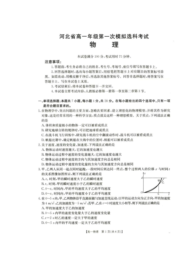 高一物理--河北省保定市部分高中2025-2026学年高一上学期10月月考