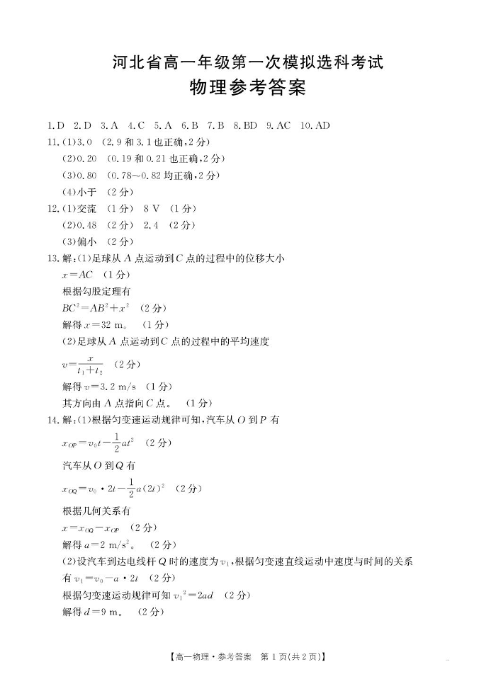 高一物理答案--河北省保定市部分高中2025-2026学年高一上学期10月月考