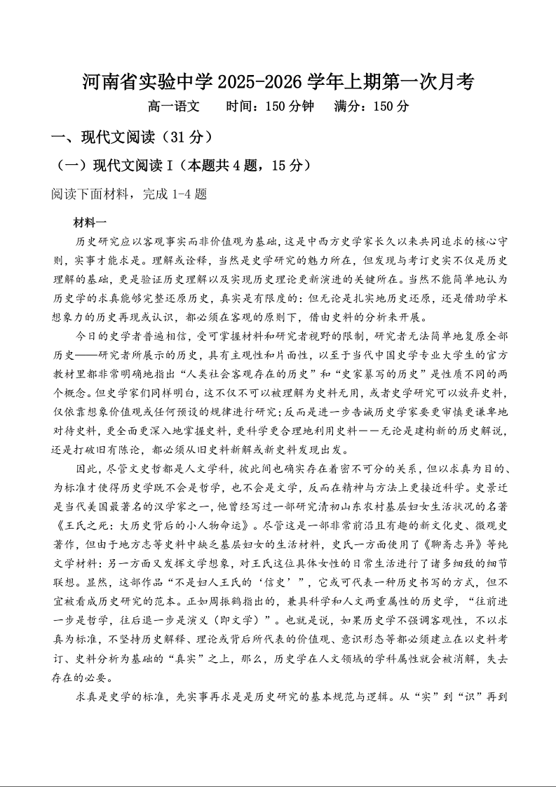 高一语文--河南省实验中学2025-2026学年高一上学期第一次月考