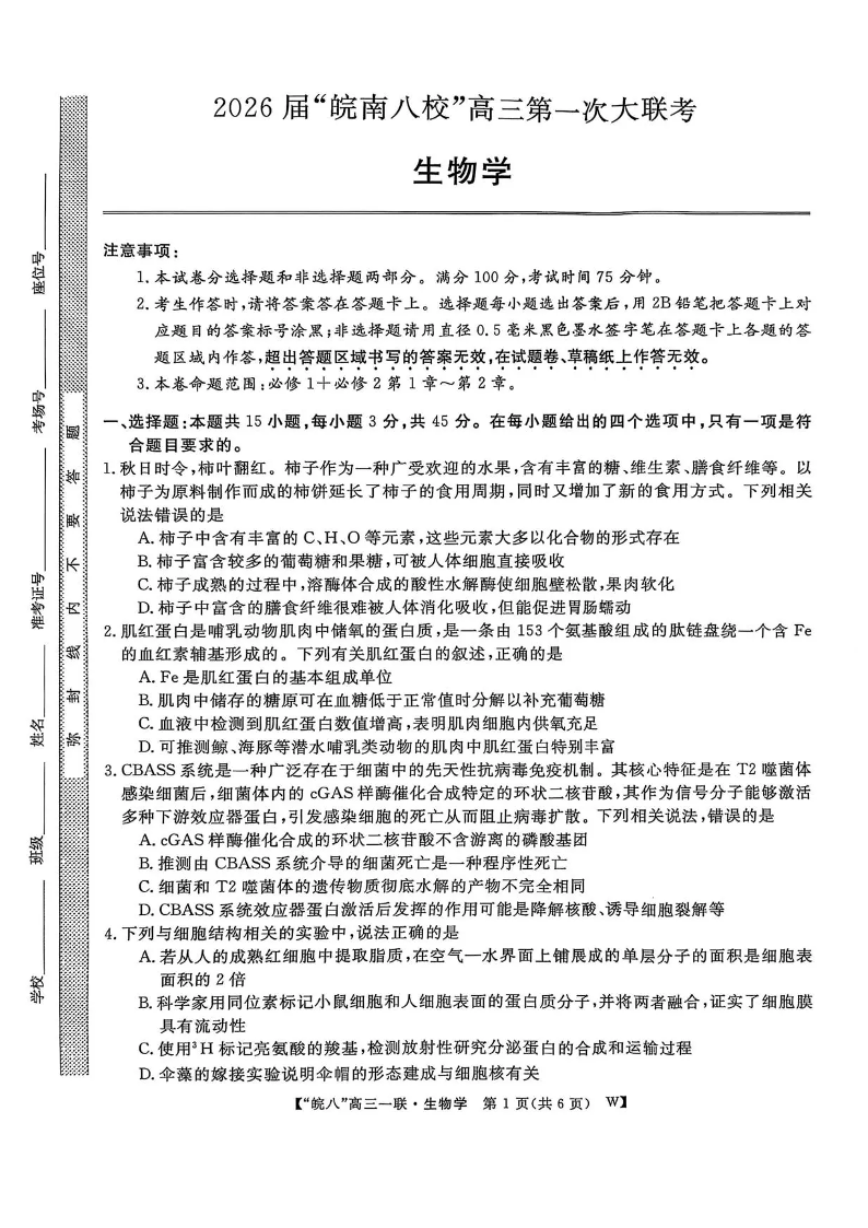 高三生物+答案--安徽省皖南八校2026届高三上学期第一次大联考