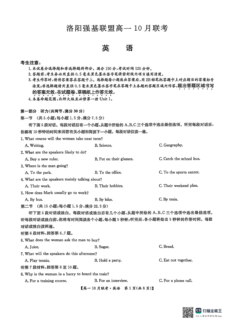 高一英语-河南省洛阳强基联盟2025-2026学年高一上学期10月联考