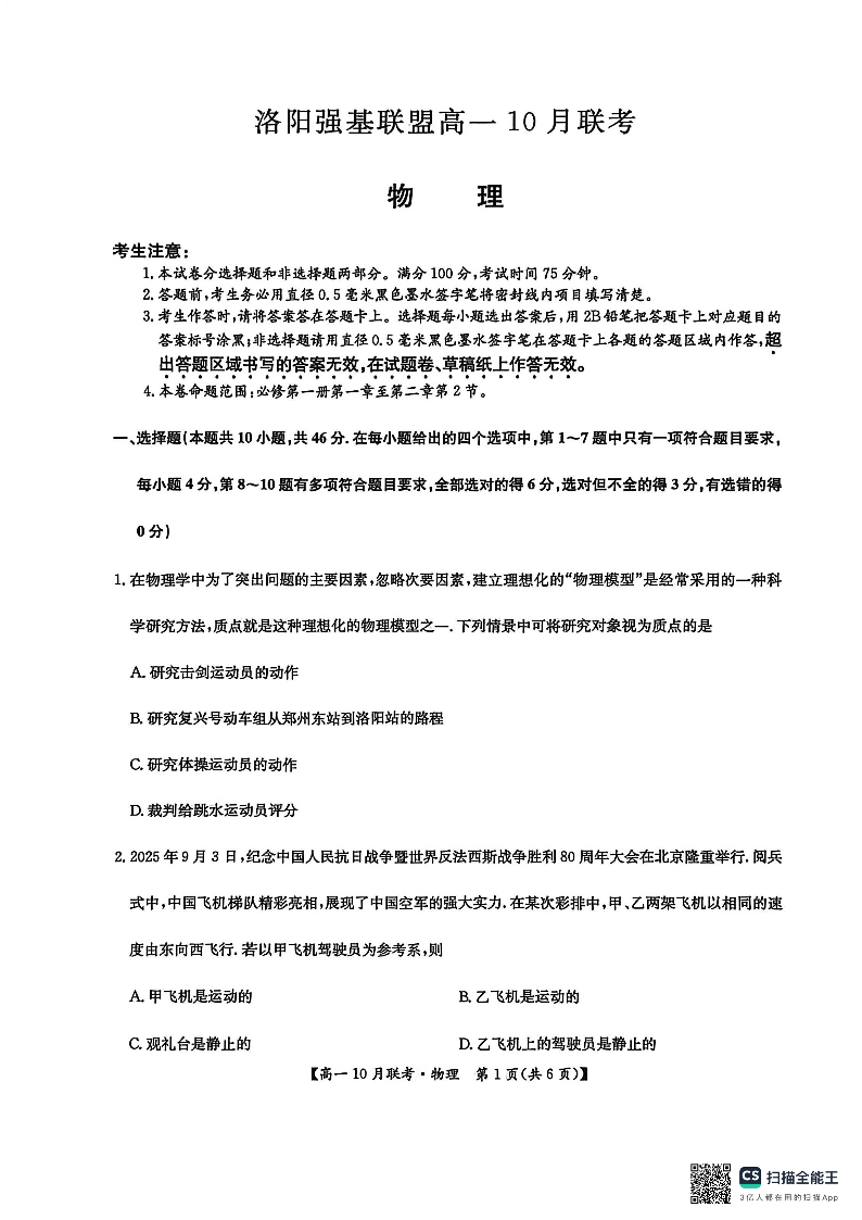 高一物理-河南省洛阳强基联盟2025-2026学年高一上学期10月联考