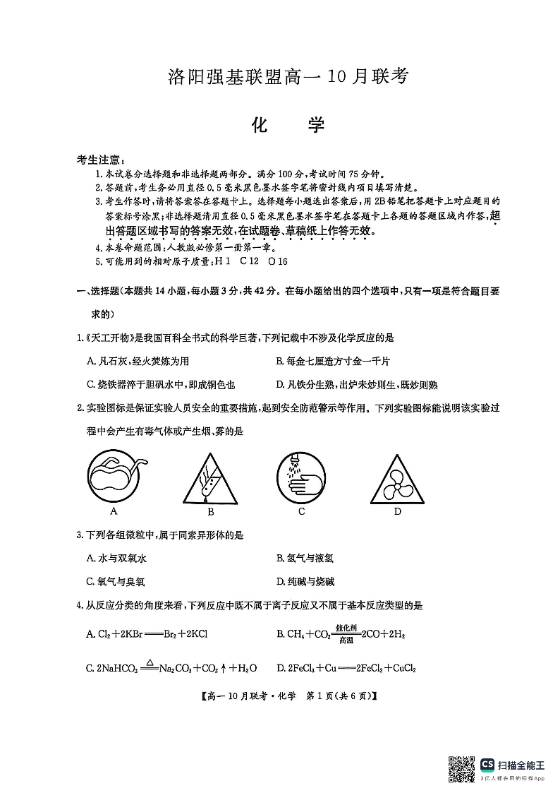 高一化学-河南省洛阳强基联盟2025-2026学年高一上学期10月联考