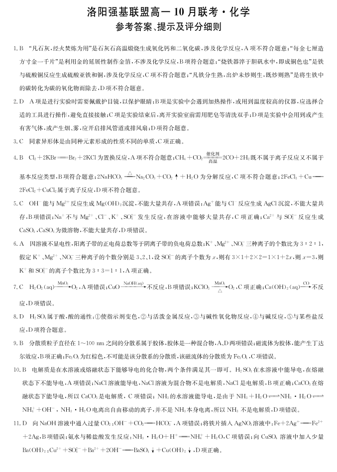 高一化学答案-河南省洛阳强基联盟2025-2026学年高一上学期10月联考