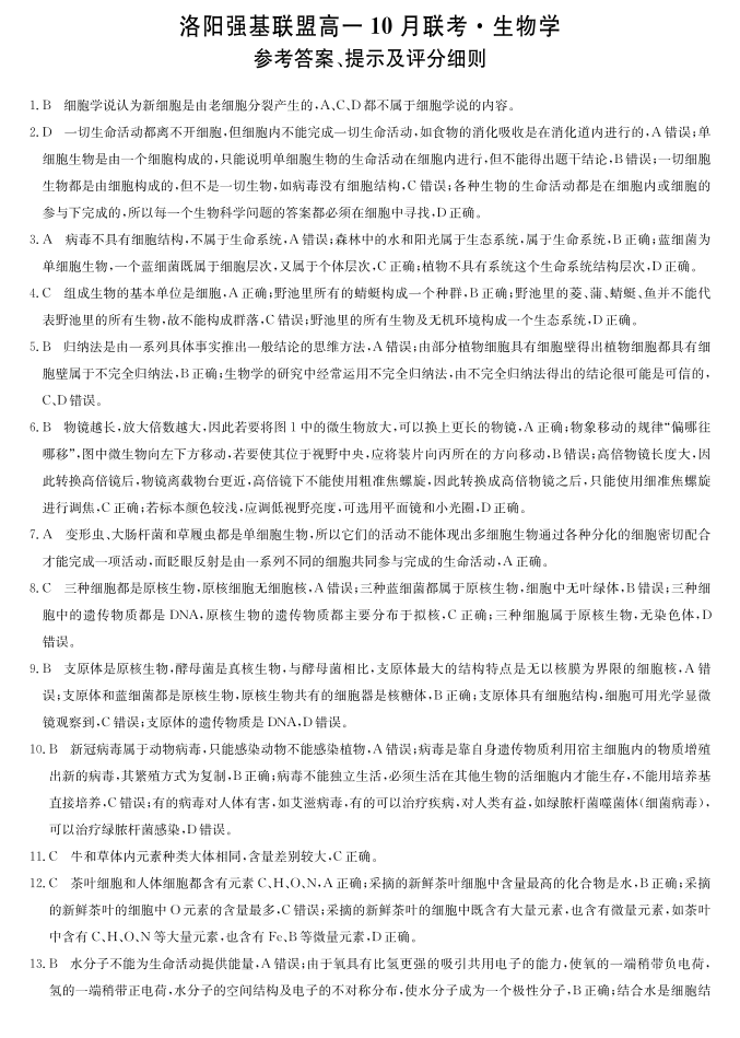 高一生物答案-河南省洛阳强基联盟2025-2026学年高一上学期10月联考