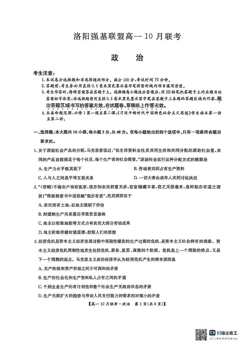 高一政治-河南省洛阳强基联盟2025-2026学年高一上学期10月联考
