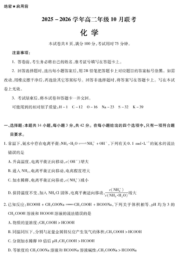 高二化学--河北省保定市部分示范高中2025-2026学年高二上学期10月月考
