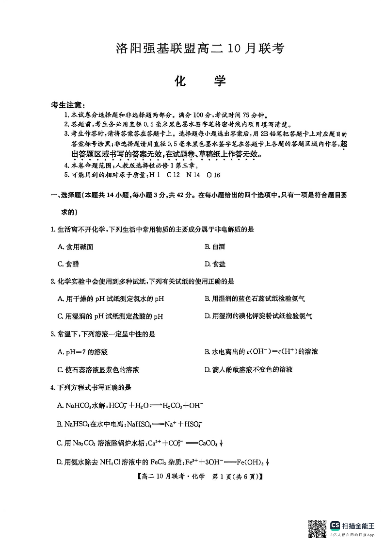 高二化学--河南洛阳强基联盟2025-2026学年高二上学期10月联考