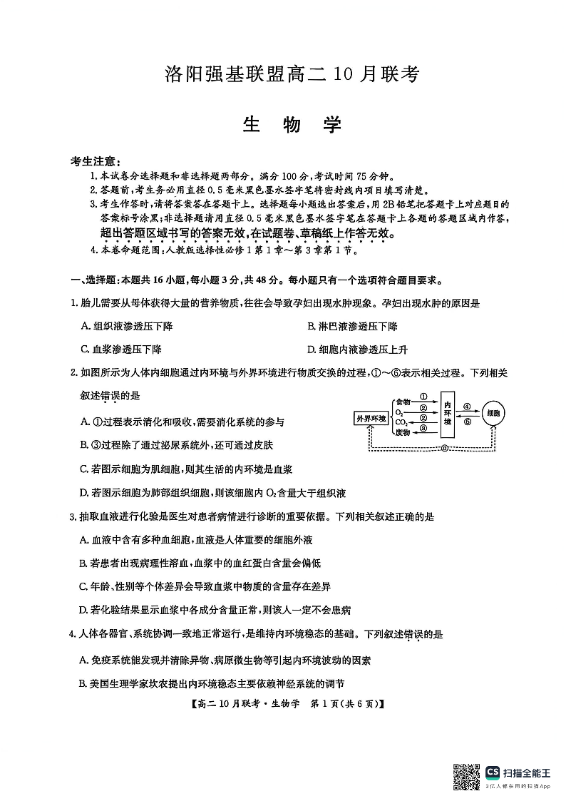 高二生物--河南洛阳强基联盟2025-2026学年高二上学期10月联考
