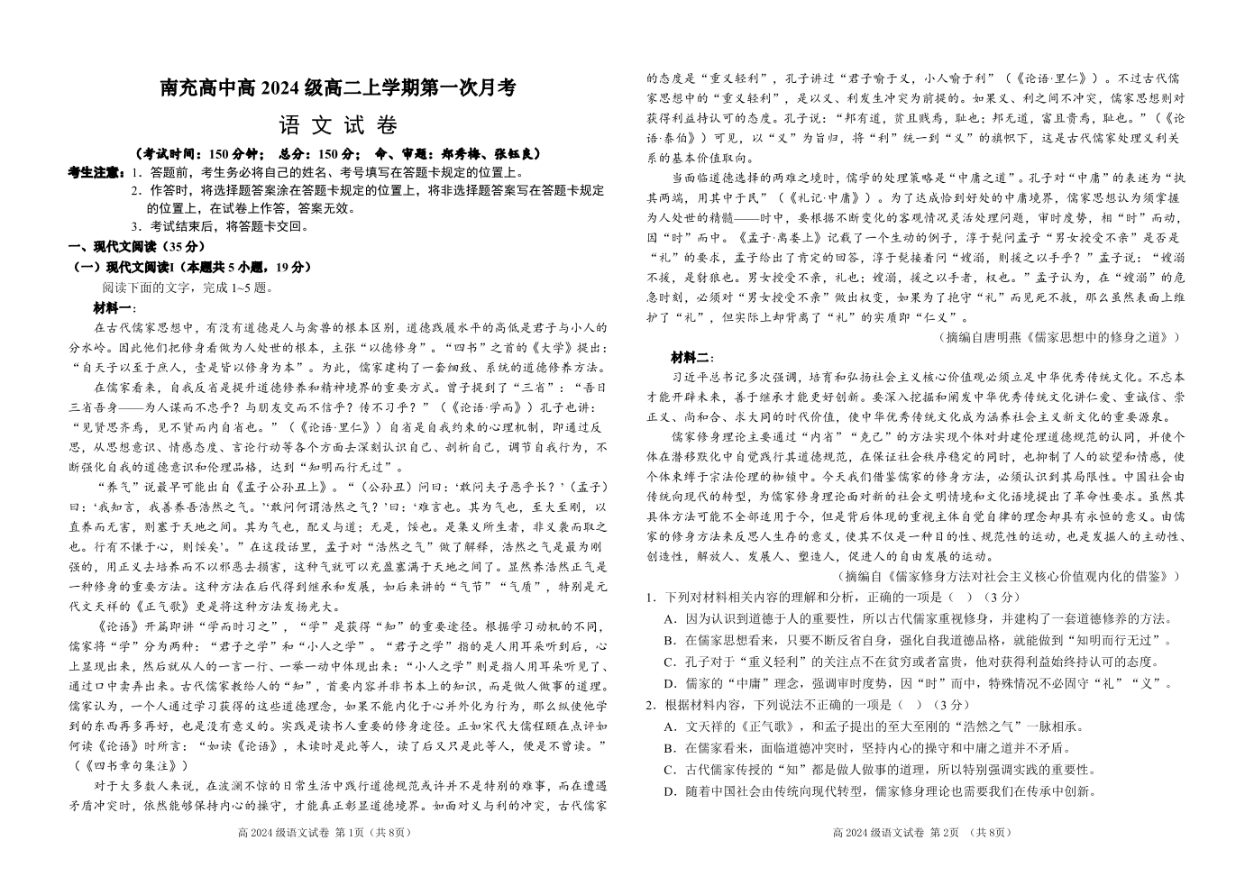 高二语文--四川省南充高级中学2025-2026学年高二上学期10月月考