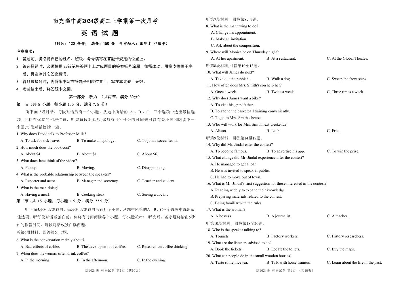 高二英语--四川省南充高级中学2025-2026学年高二上学期10月月考