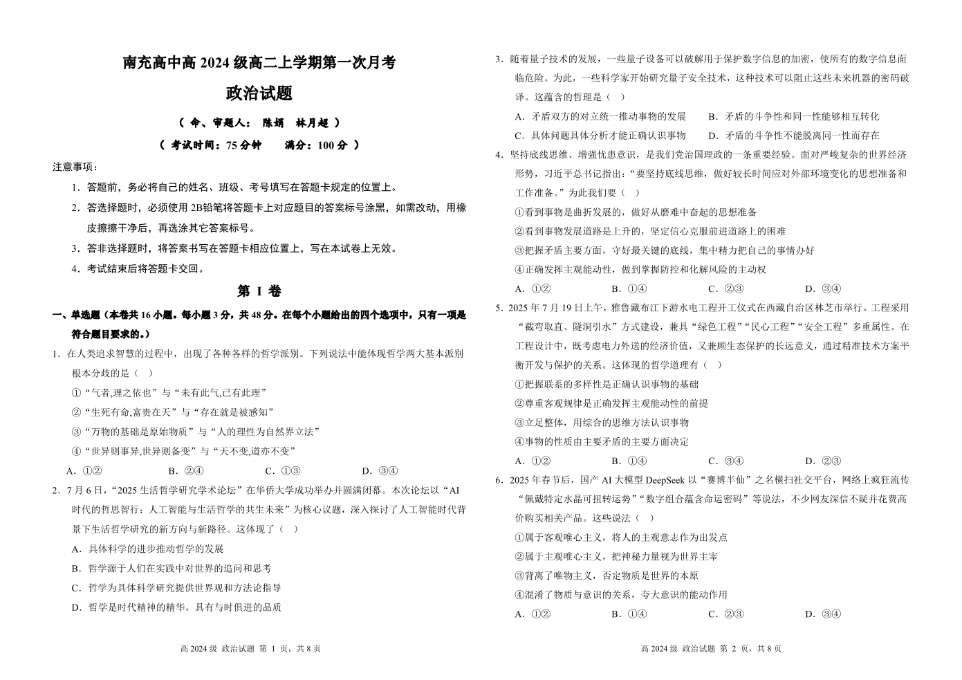 高二政治--四川省南充高级中学2025-2026学年高二上学期10月月考